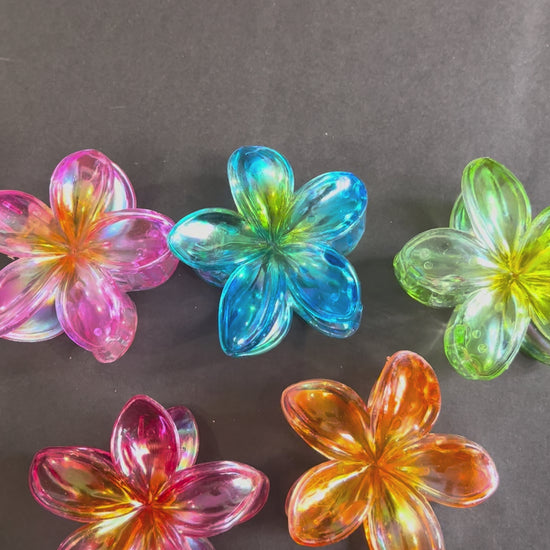 Bright and glossy flower clips crafted from durable plastic with a firm grip. Perfect for vacations, parties, or adding a bold and colorful touch to your everyday look.