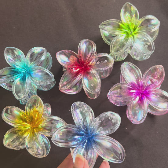 Shiny holographic flower clips made from durable plastic with a strong grip. Perfect for vacations, parties, festive styling, or adding a dazzling highlight to everyday looks.